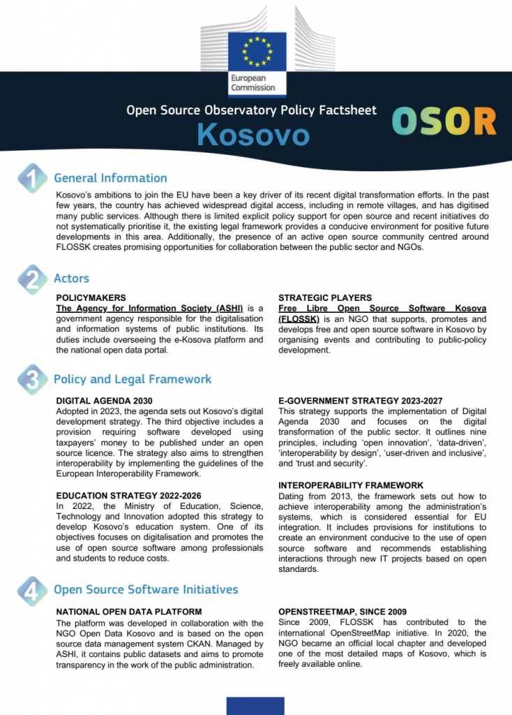 Starting this year, the European Commission’s Open Source Observatory (OSOR) has published a dedicated Country Intelligence Report on the Republic of Kosovo.
